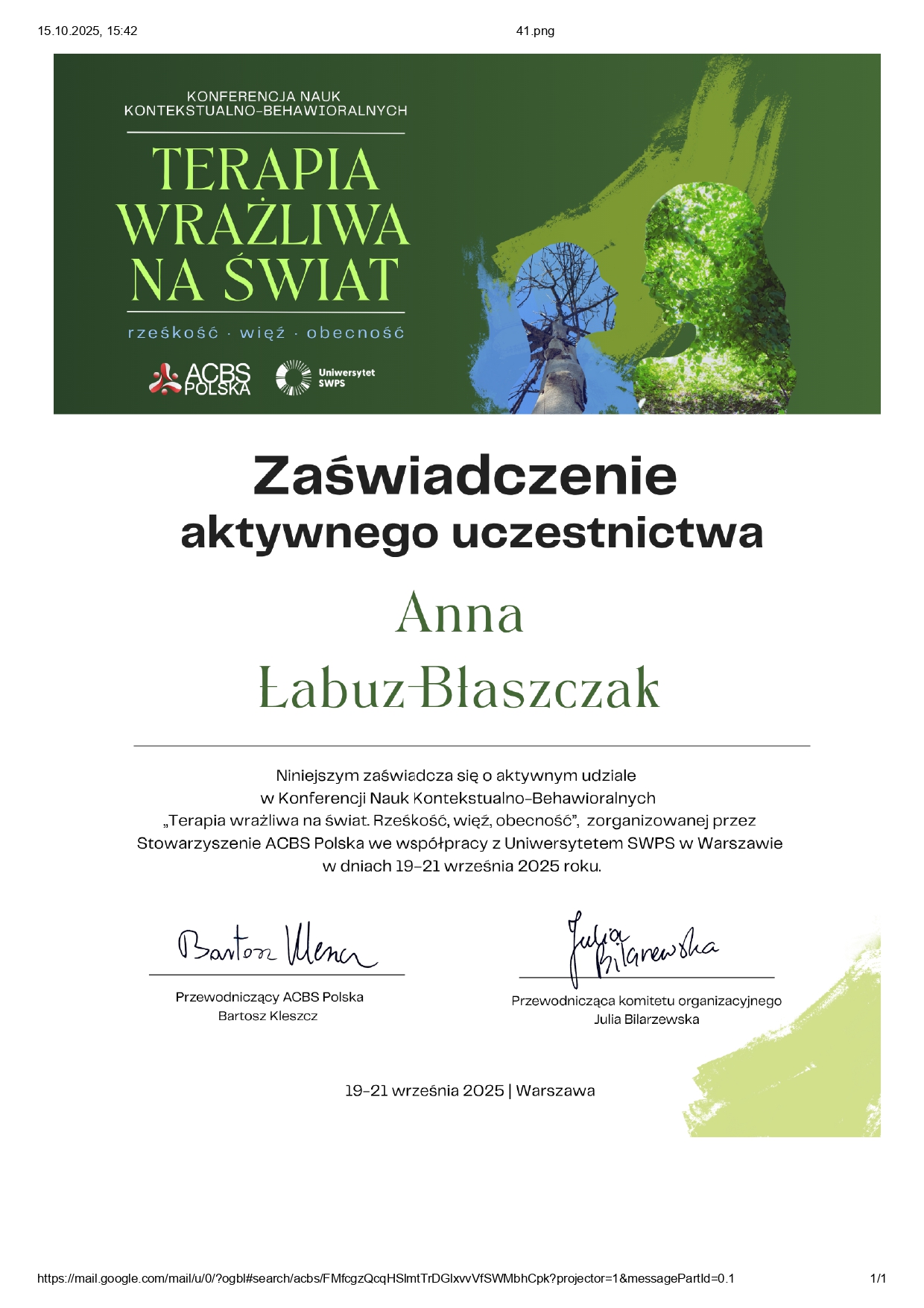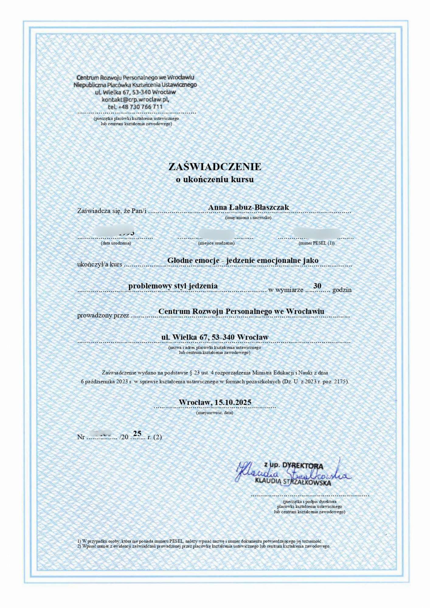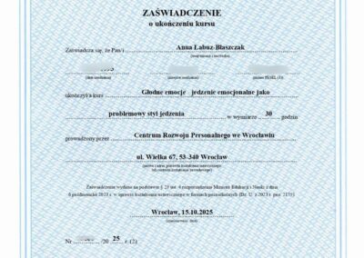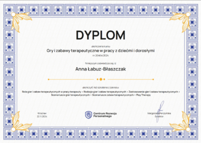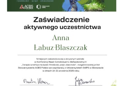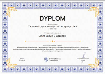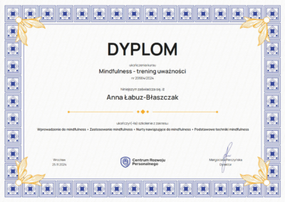 Obecnie kontynuuję poszerzanie kwalifikacji w nurtach trzeciej fali. Chcę również lepiej rozumieć osoby neuroatypowe, do których sama się zaliczam — to doświadczenie nauczyło mnie, jak ważna jest autentyczność w terapii. Pracuję pod regularną superwizją u dr Natalii Liszewskiej, bo wierzę, że najlepszą pomocą jest terapeuta, który sam nieustannie się rozwija.