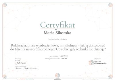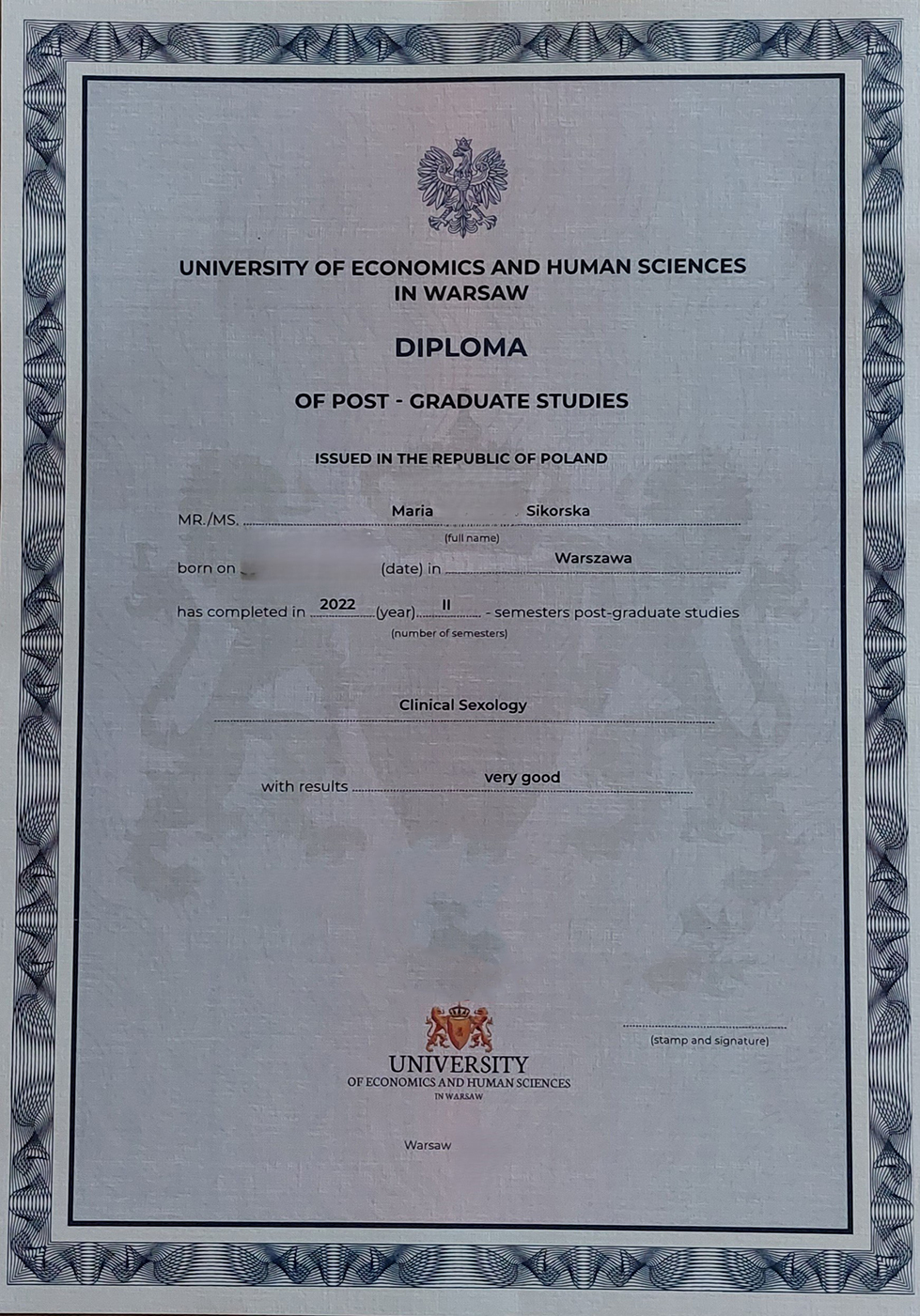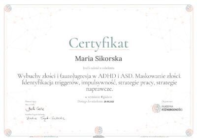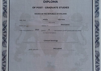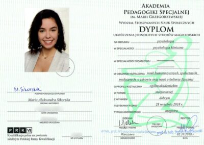 Ukończyłam studia podyplomowe z seksuologii klinicznej, a doświadczenie zdobywałam m.in. na Oddziale Dziennym Młodzieżowym, gdzie prowadziłam warsztaty psychorozwojowe oraz zajęcia mindfulness i regulacji emocji.