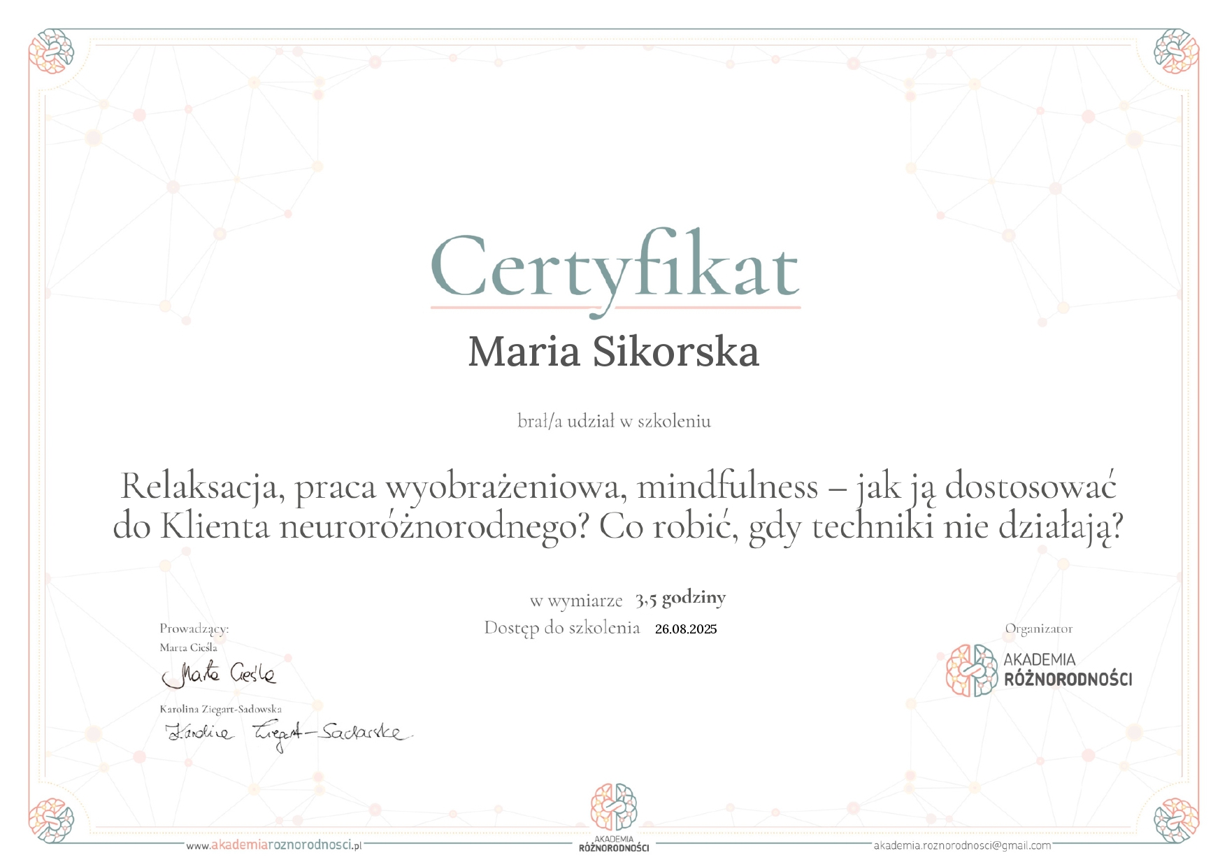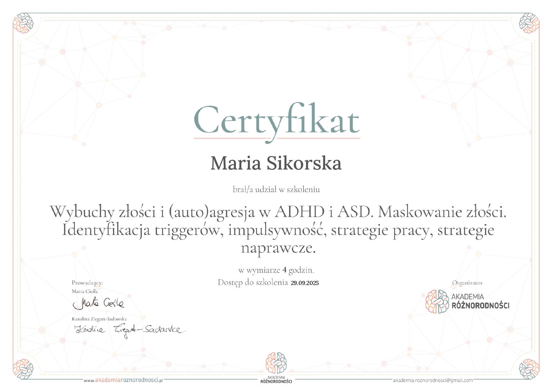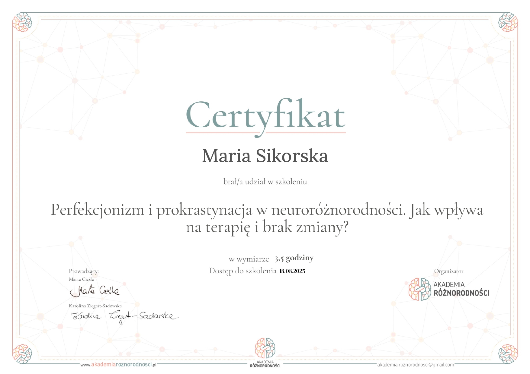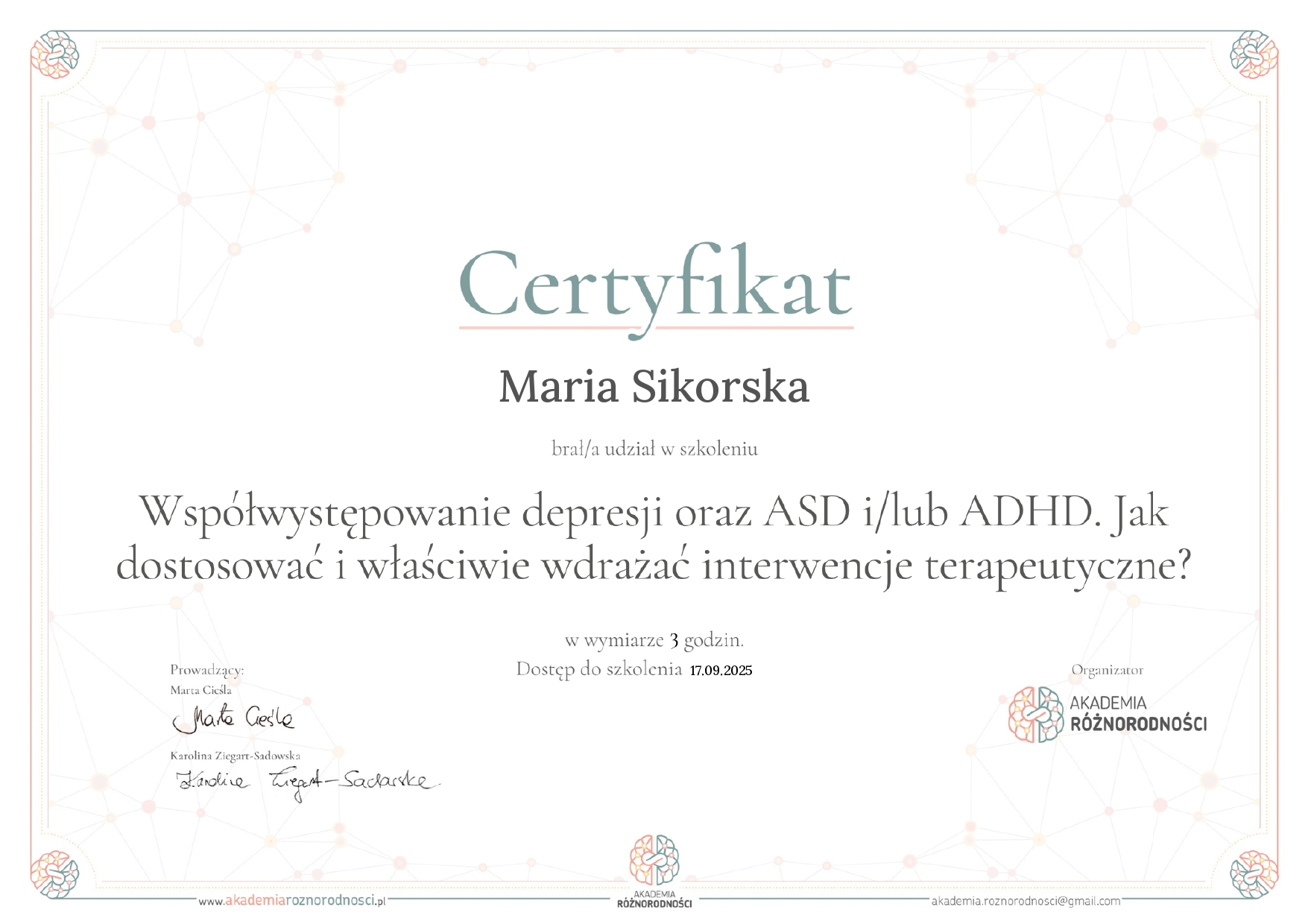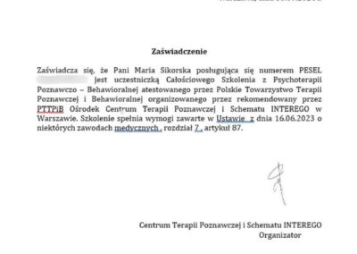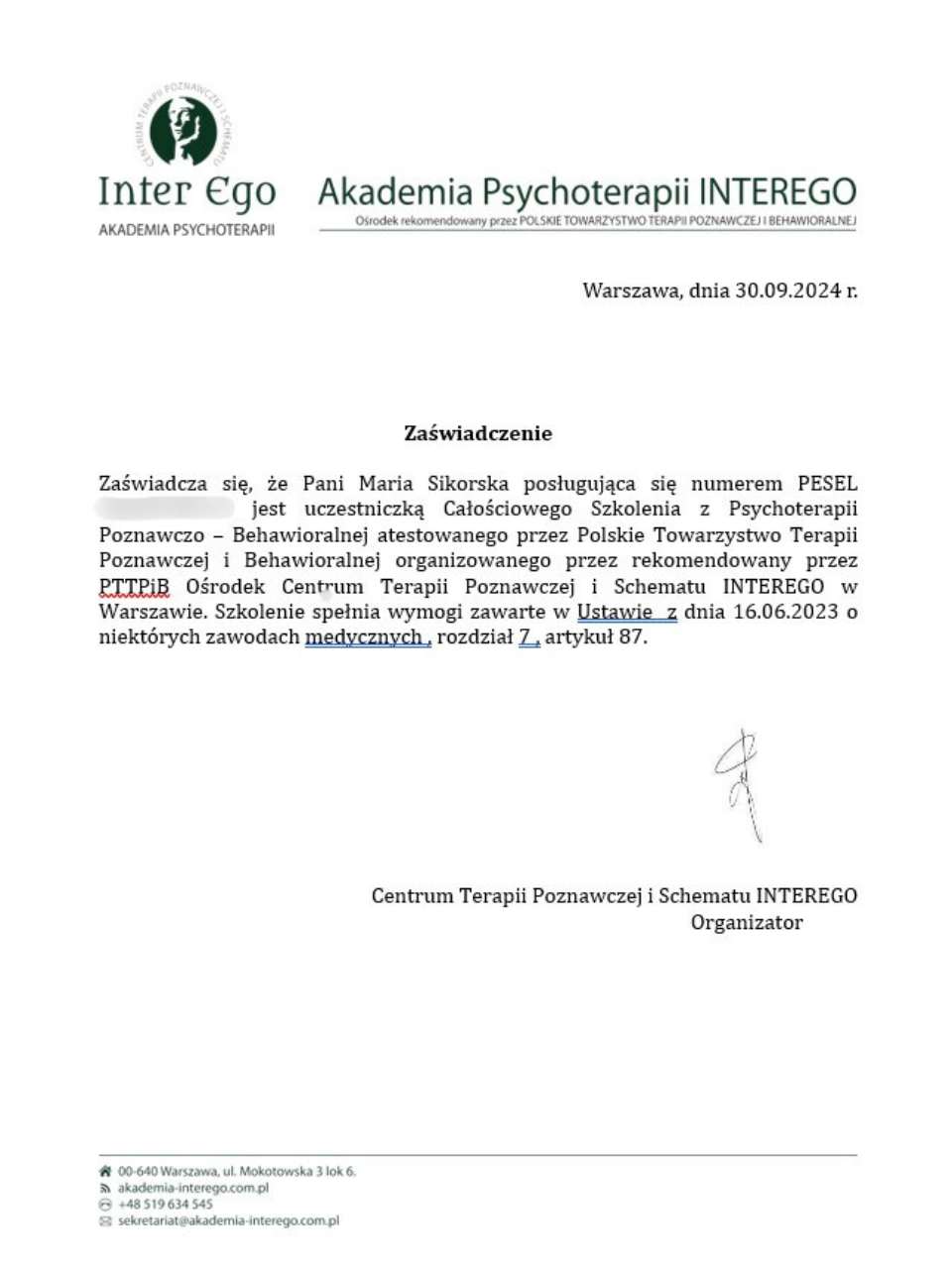 Jestem w trakcie 4-letniego kursu psychoterapii poznawczo-behawioralnej w Inter Ego Centrum Terapii Poznawczej i Schematu. Odbyłam własną terapię w nurcie CBT i otwarcie mówię o wartości korzystania ze wsparcia — to doświadczenie wzbogaciło mnie zarówno jako człowieka, jak i terapeutkę. Regularnie poddaję swoją pracę superwizji u dr Natalii Liszewskiej, bo rozwój terapeuty jest fundamentem skutecznej pomocy.