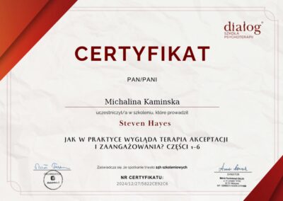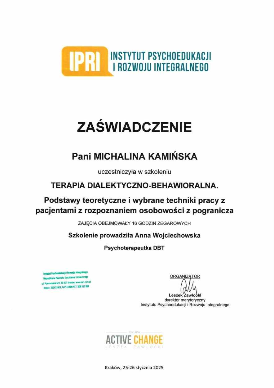 Jako certyfikowana nauczycielka MBSR (Mindfulness-Based Stress Reduction) i jogi (RYT 200h), wprowadzam do terapii elementy pracy z ciałem i oddechem. Szczególnie bliska jest mi praca z metaforą, która pozwala spojrzeć na własne doświadczenia z nowej perspektywy. W połączeniu z podejściem systemowym i technikami trzeciej fali terapii behawioralnej (ACT, DBT, MBCT), tworzy to kompleksową metodę wspierającą rozwój i radzenie sobie z wyzwaniami.