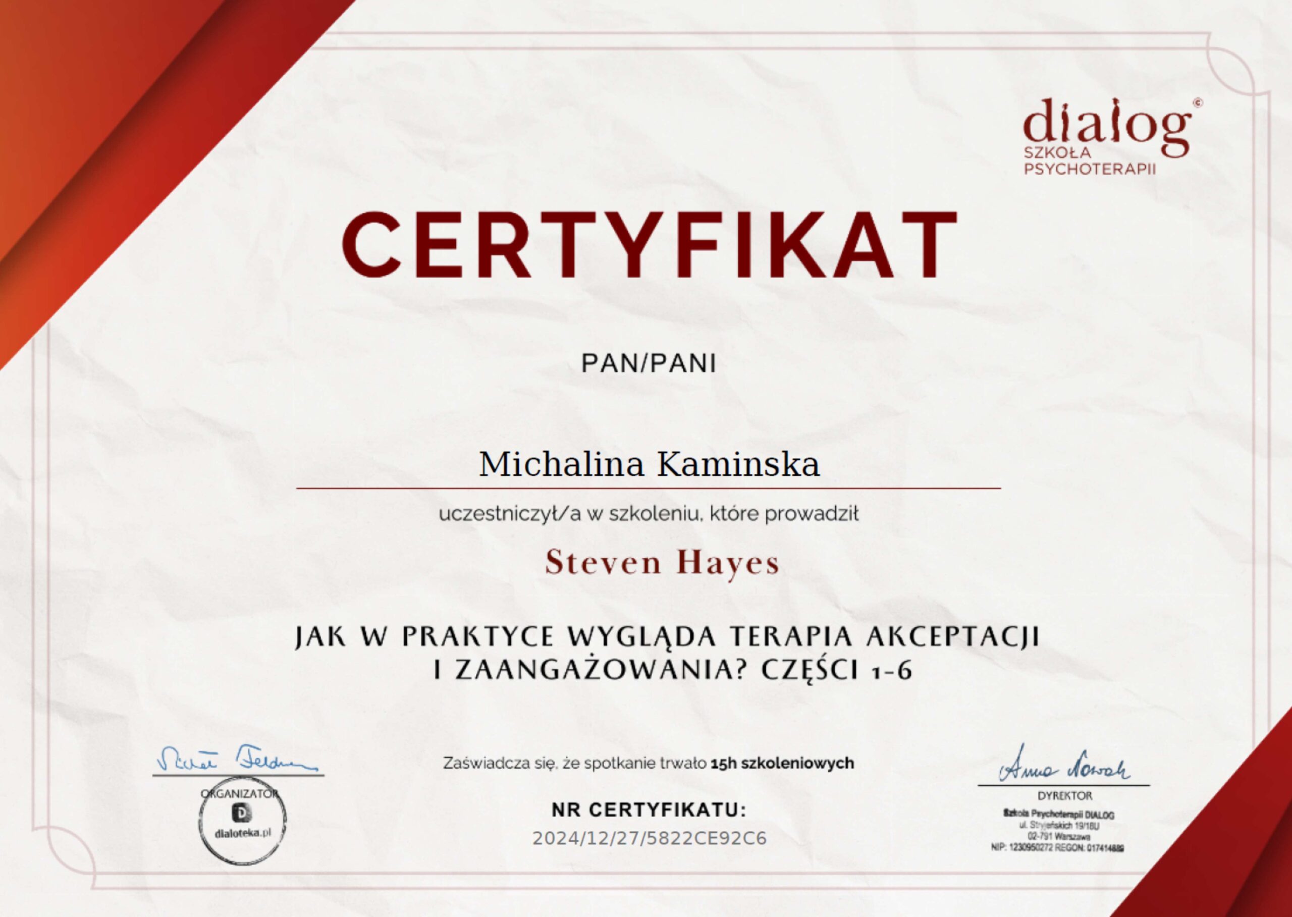 Moje doświadczenie obejmuje prowadzenie terapii indywidualnej i grupowej, warsztatów rozwoju osobistego oraz autorskich programów łączących psychologię z praktykami uważności. Aktualnie rozwijam się w nurcie trzeciej fali terapii behawioralnych, gdzie fascynuje mnie szczególnie integracja zachodniej psychologii ze wschodnimi praktykami uważności. Pracuję pod regularną superwizją u dr Natalii Liszewskiej, wierząc, że najlepsza pomoc płynie od terapeuty, który sam nieustannie się rozwija.