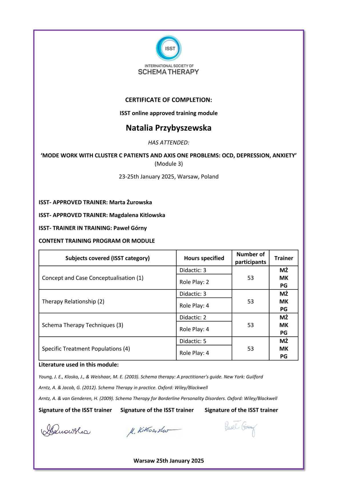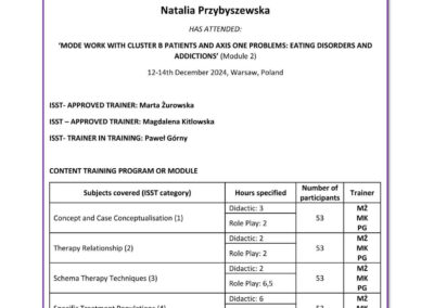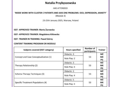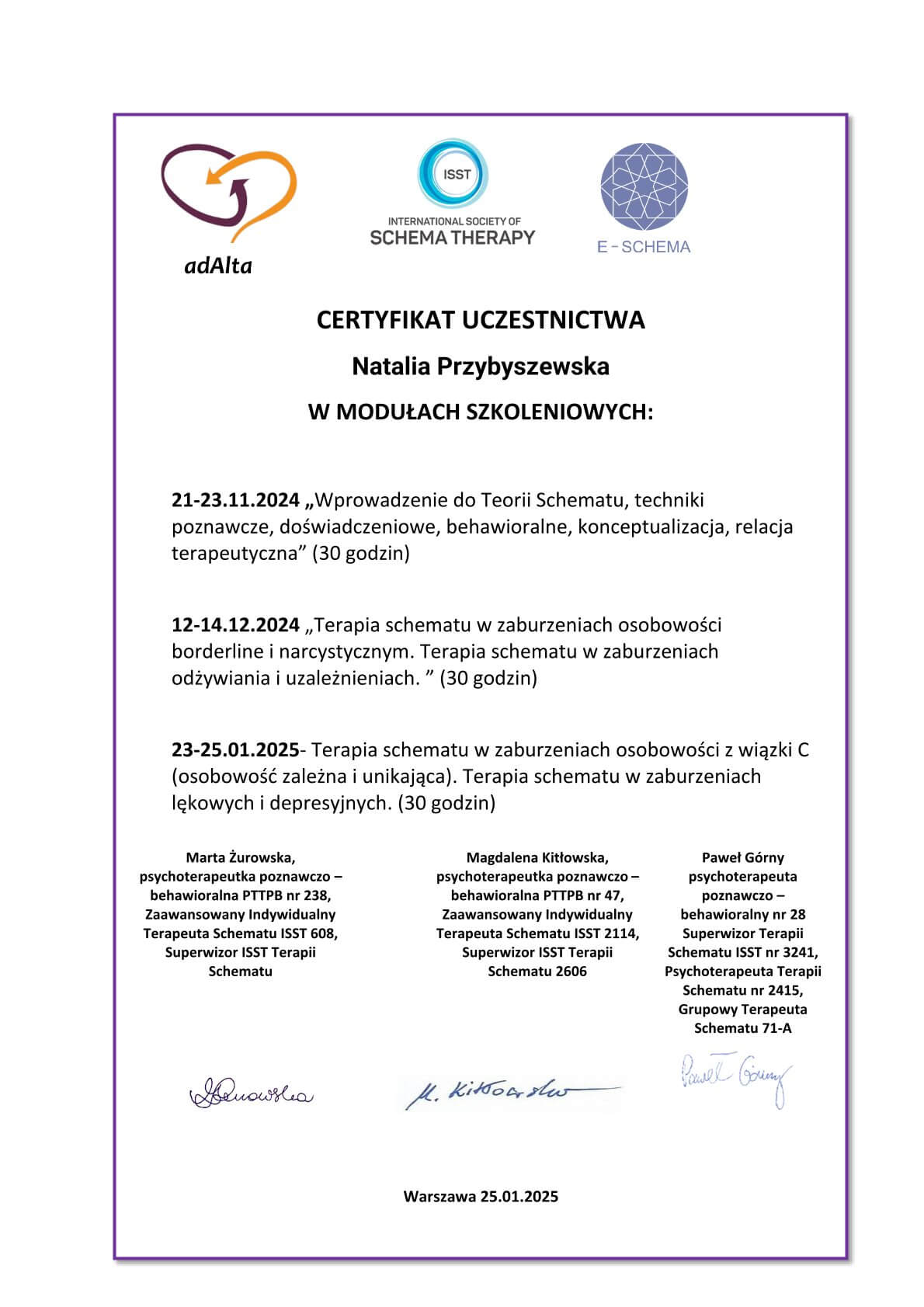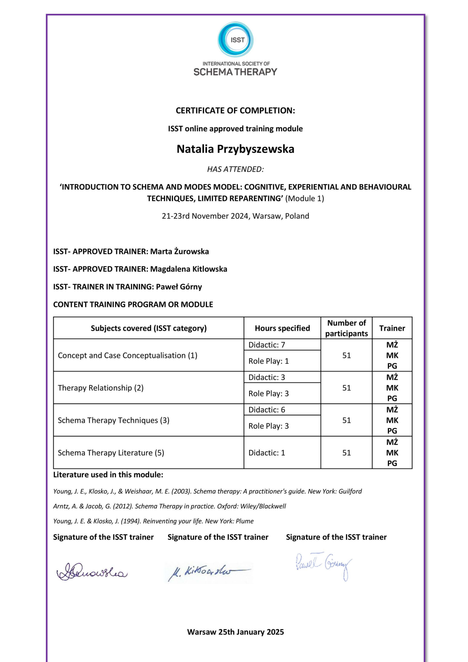 Nieustannie poszerzam swoje kompetencje w obszarze terapii trzeciofalowych oraz technik pracy z ciałem (jak Somatic Experiencing) i praktyk mindfulness. Jestem w trakcie procesu superwizyjnego w ramach całościowego szkolenia z Terapii Schematów, wierząc, że ciągły rozwój terapeuty jest niezbędny do skutecznej pomocy.