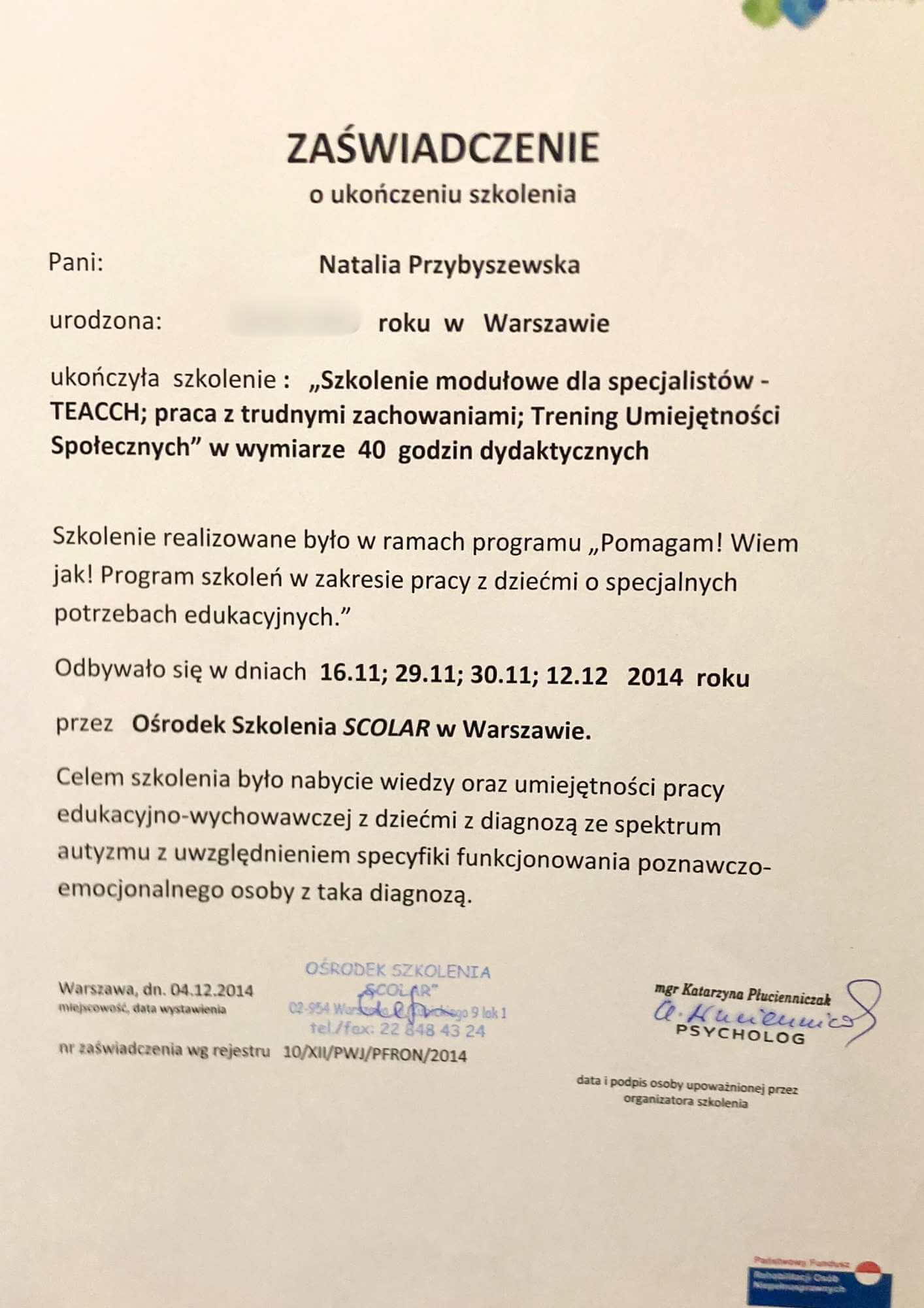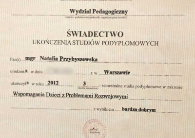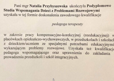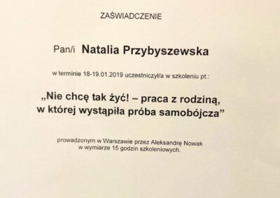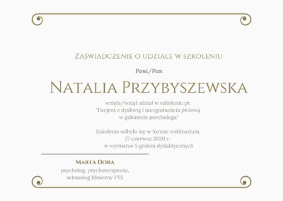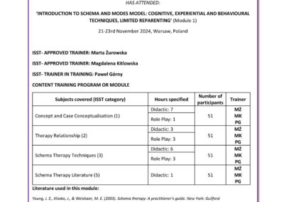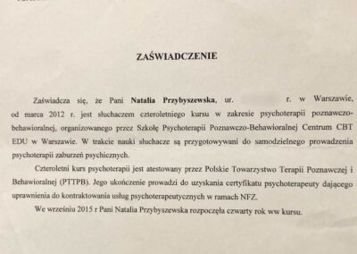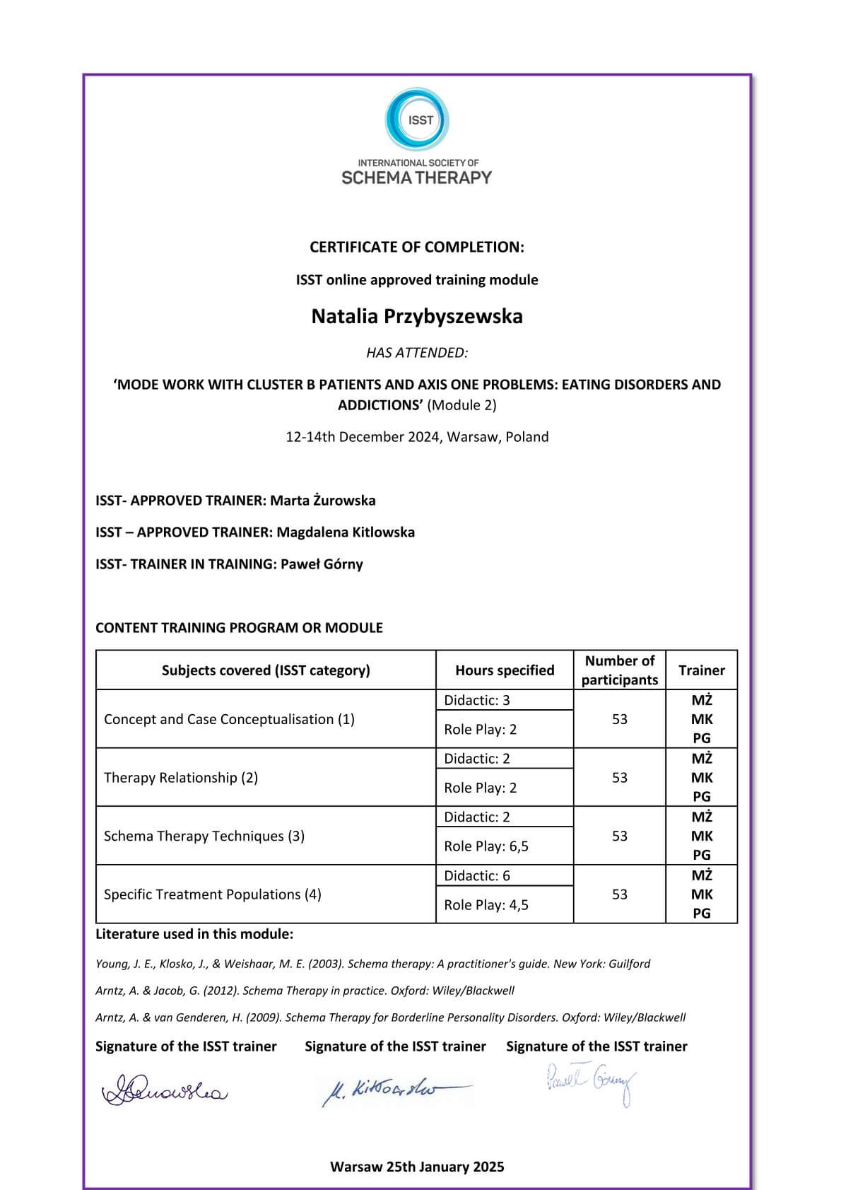 Nieustannie poszerzam swoje kompetencje w obszarze terapii trzeciofalowych oraz technik pracy z ciałem (jak Somatic Experiencing) i praktyk mindfulness. Jestem w trakcie procesu superwizyjnego w ramach całościowego szkolenia z Terapii Schematów, wierząc, że ciągły rozwój terapeuty jest niezbędny do skutecznej pomocy.